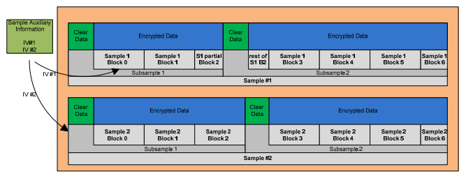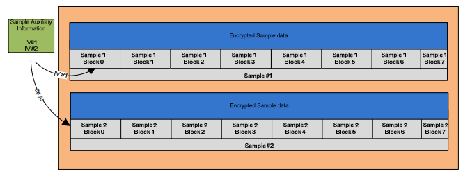 The AES-128 symmetric block cipher is incorporated by reference to encrypt elementary stream data contained in media samples. Both AES counter mode (CTR) and Cipher Block Chaining (CBC) are specified in separate protection schemes. Partial encryption using a pattern of encrypted and clear blocks is also specified in separate protection schemes. The identification of encryption keys, Initialization Vector storage and processing is specified for each scheme.